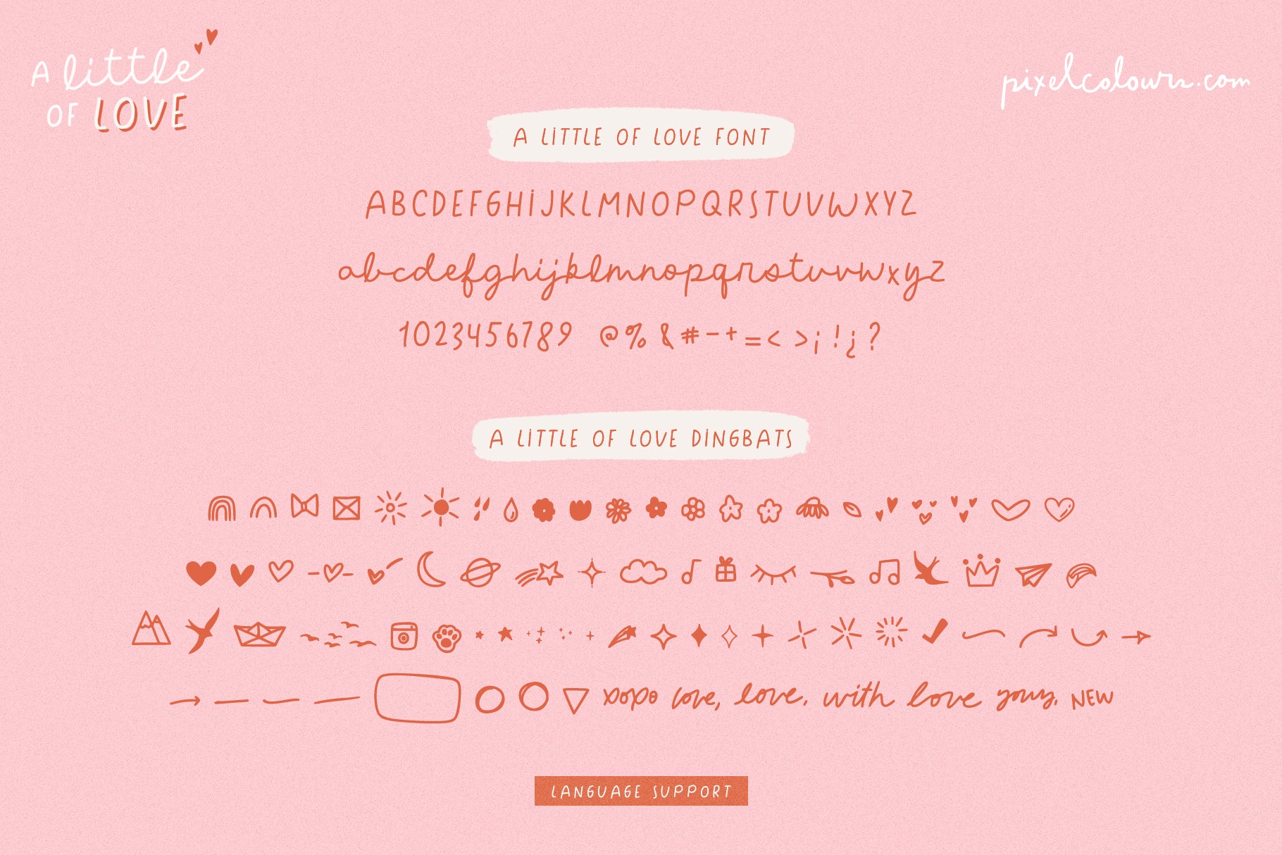 A Little of Love is a handwritten font duo that includes lots of cute dingbats to decorate quotes, social media posts, greeting cards, etc. Make combinations between the uppercase sans and the lowercase script and design beautiful projects!