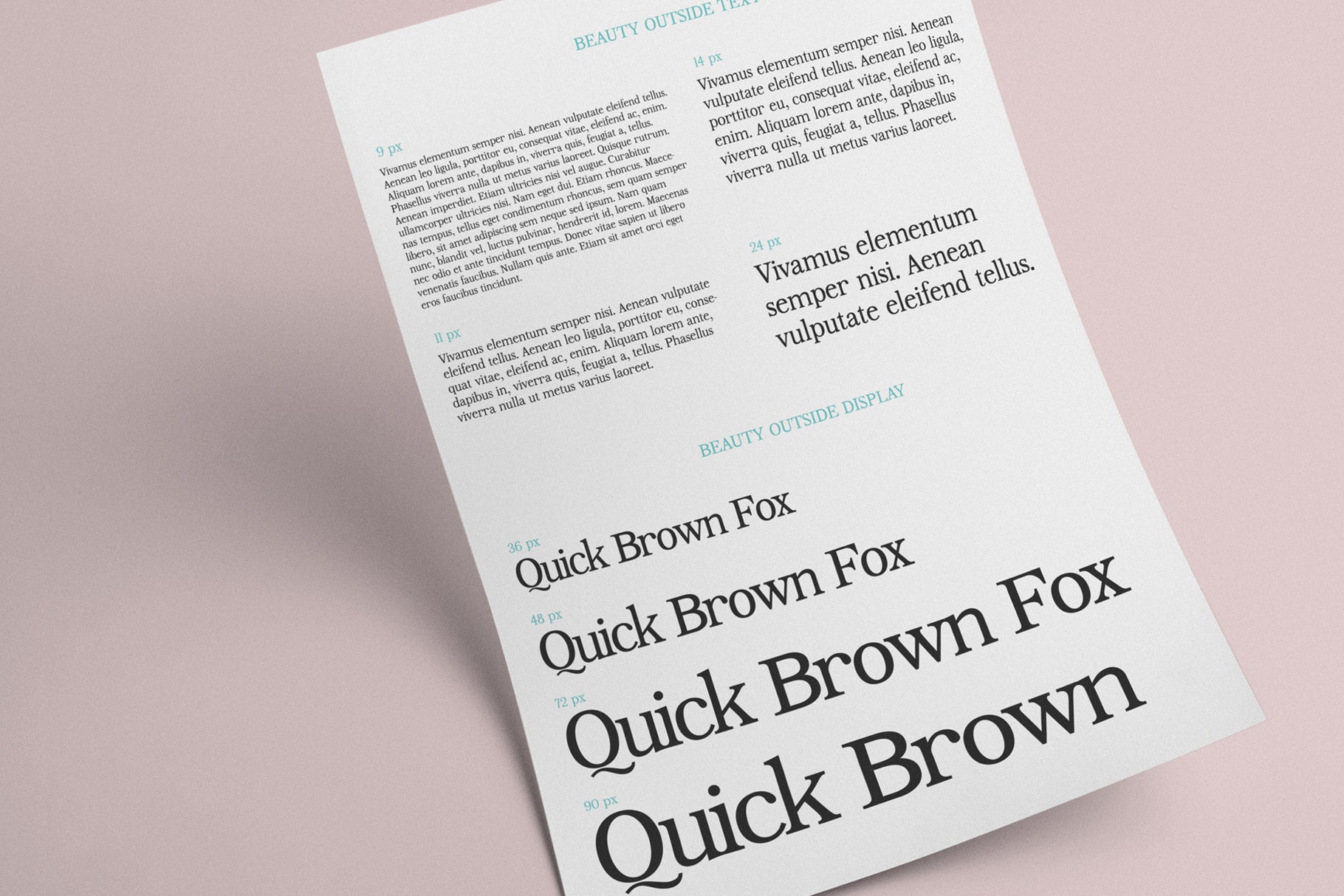 - Beauty Outside Display: a serif font with with tight letter spacing suited for larger type and headlines.
