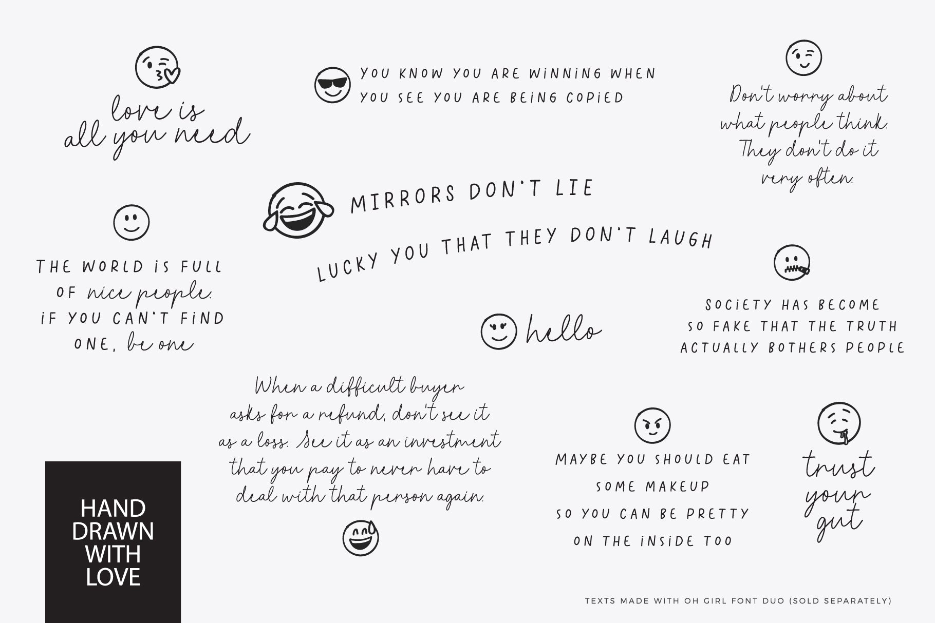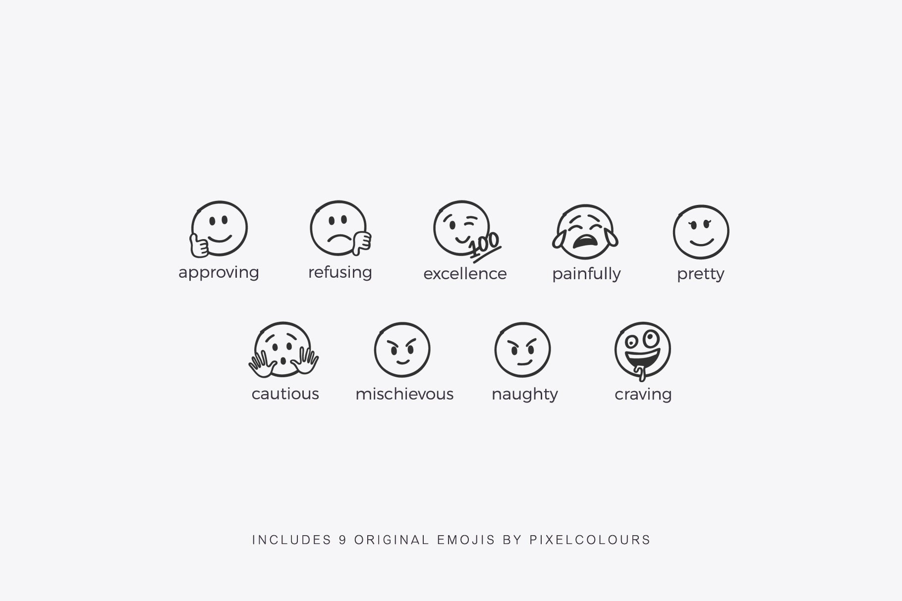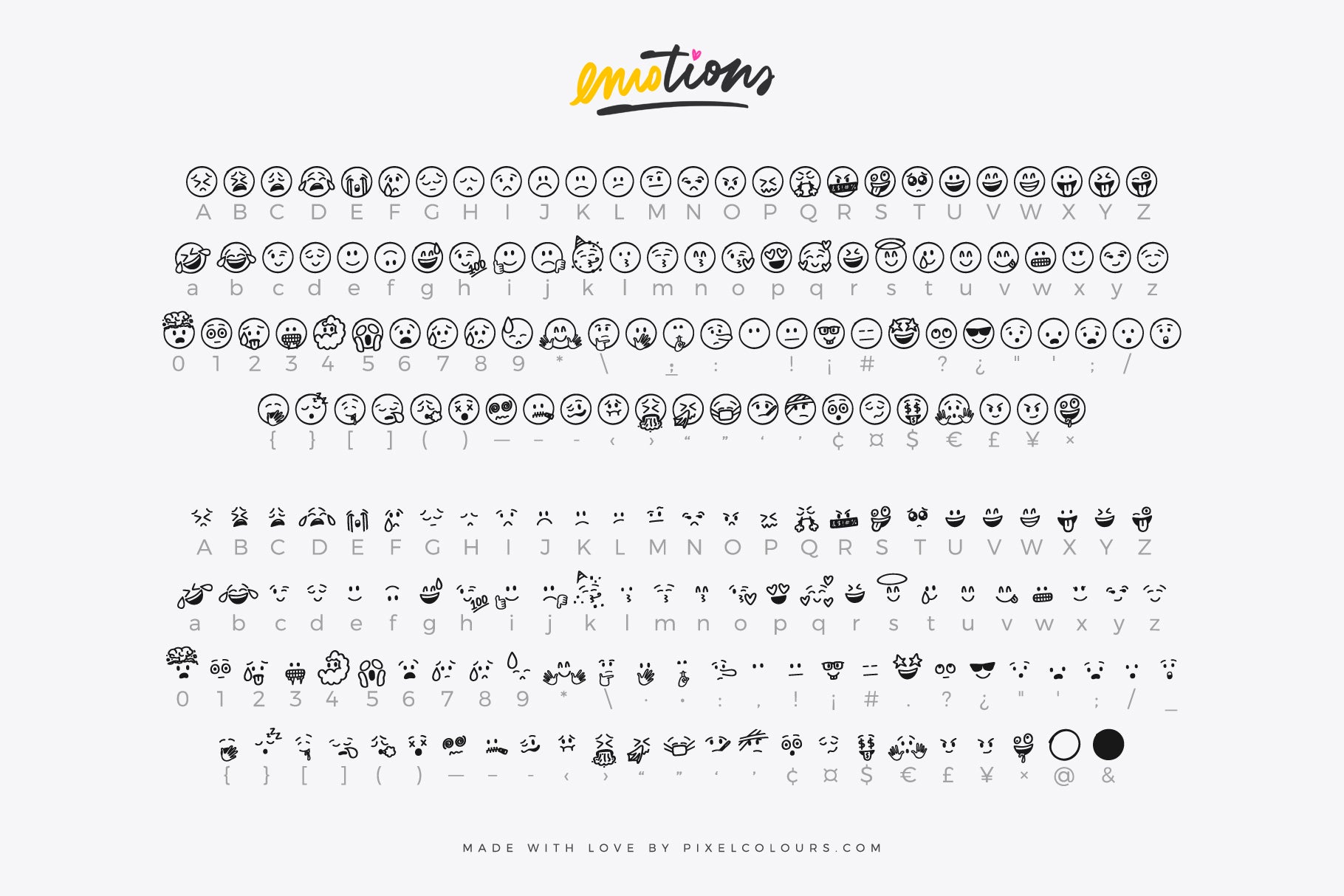 Emoji Emotions Font is a hand drawn dingbats font inspired in human emotions and feelings. Includes the complete emojis and the individual faces to create beautiful quotes, social media posts, posters, cards, ads, packaging or any design with character!