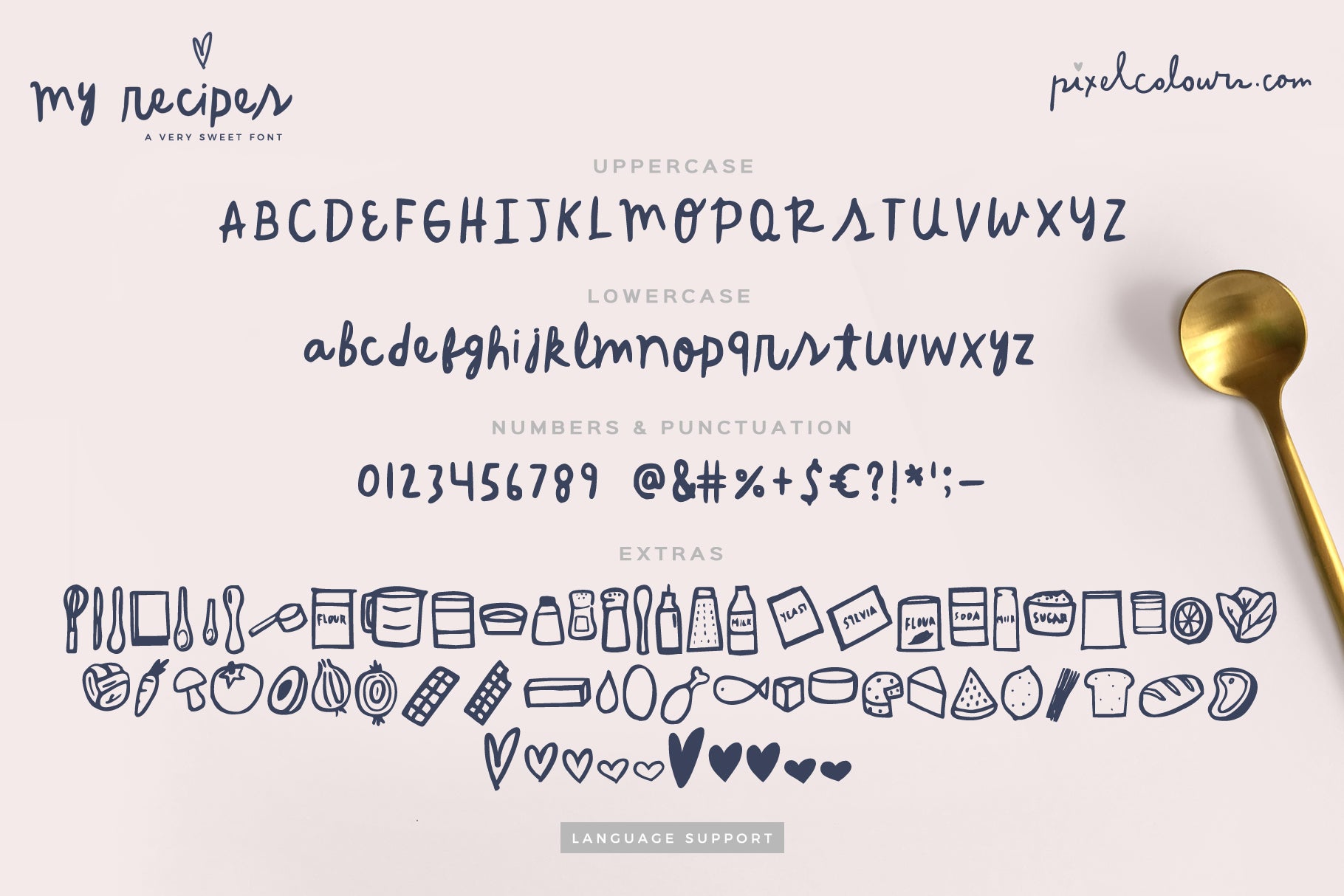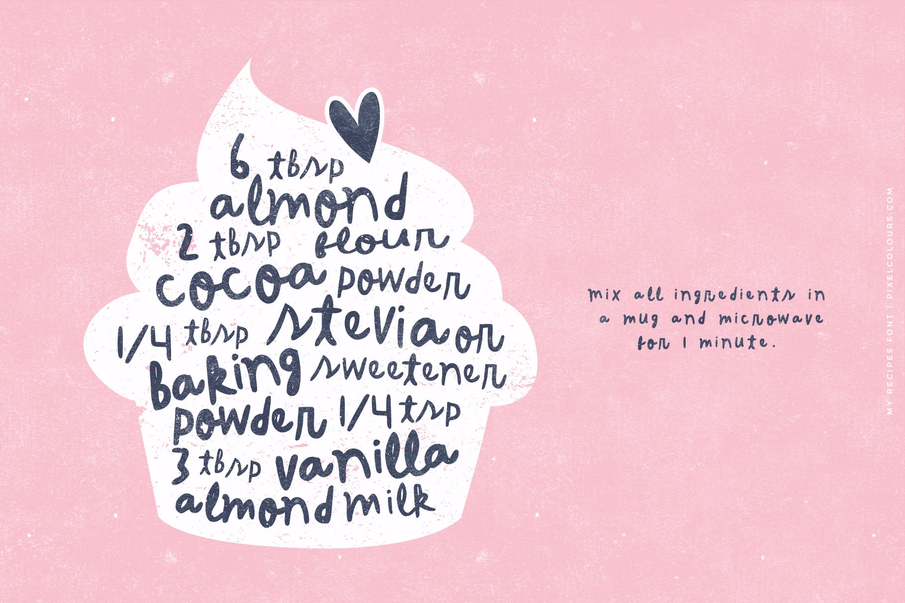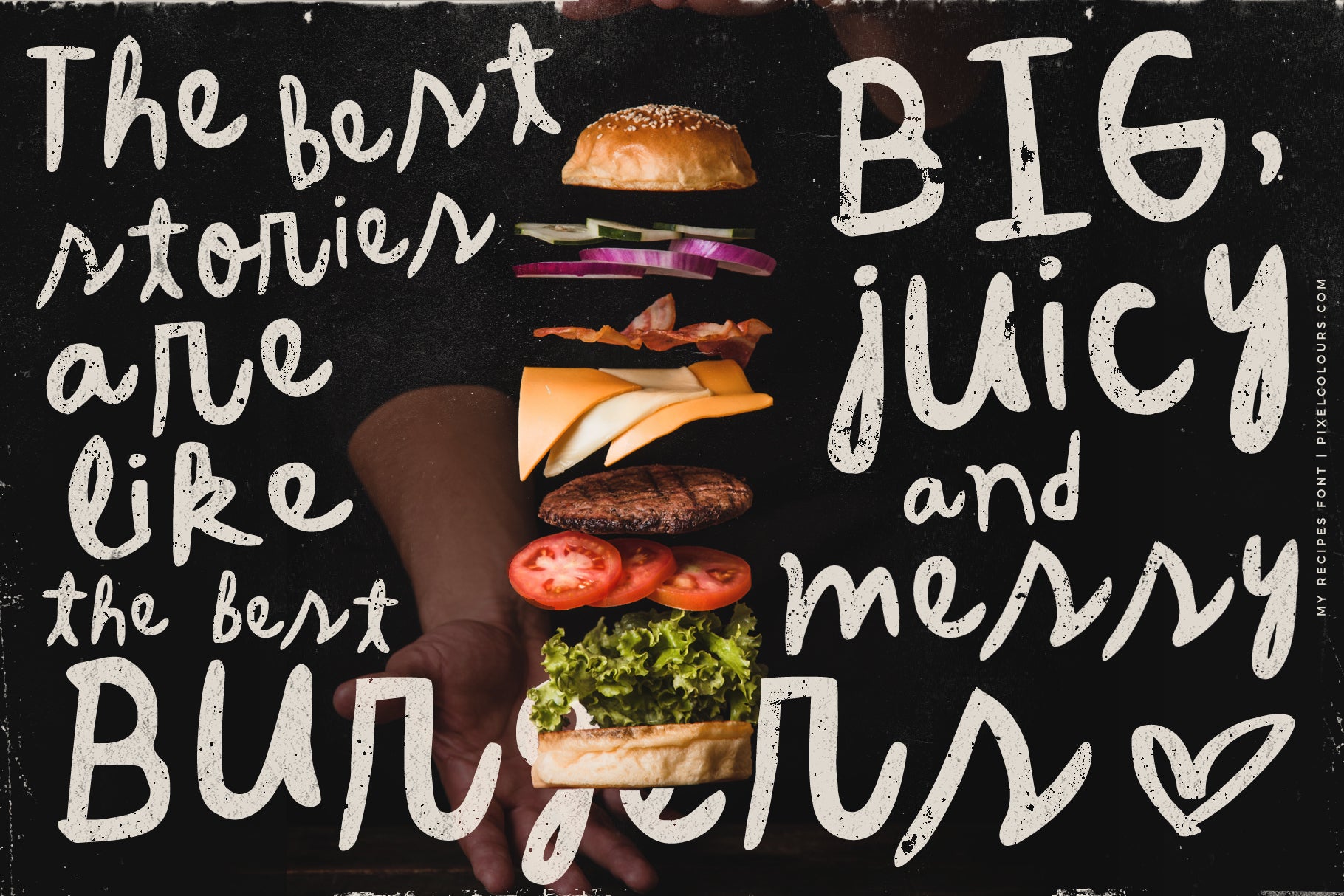My Recipes is a cool font great for cards, stationery, posters or anything you can design with a handritten style. Includes a dingbats font that contains delicious cooking illustrations, great for creating recipes, Pinterest posts and ads. A different font that you don't want to miss!