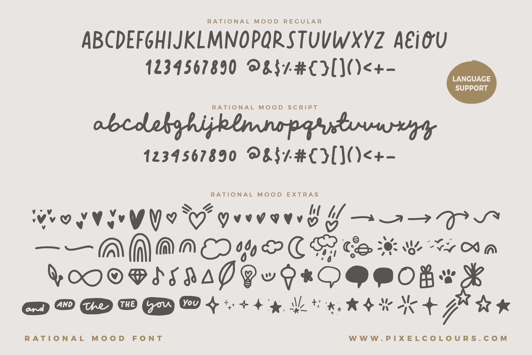 Rational Mood is a handwriting font trio that includes an uppercase, script and tons of extra illustrations to create the cutest designs. Make beautiful quotes or posts and decorate them with cute graphics.