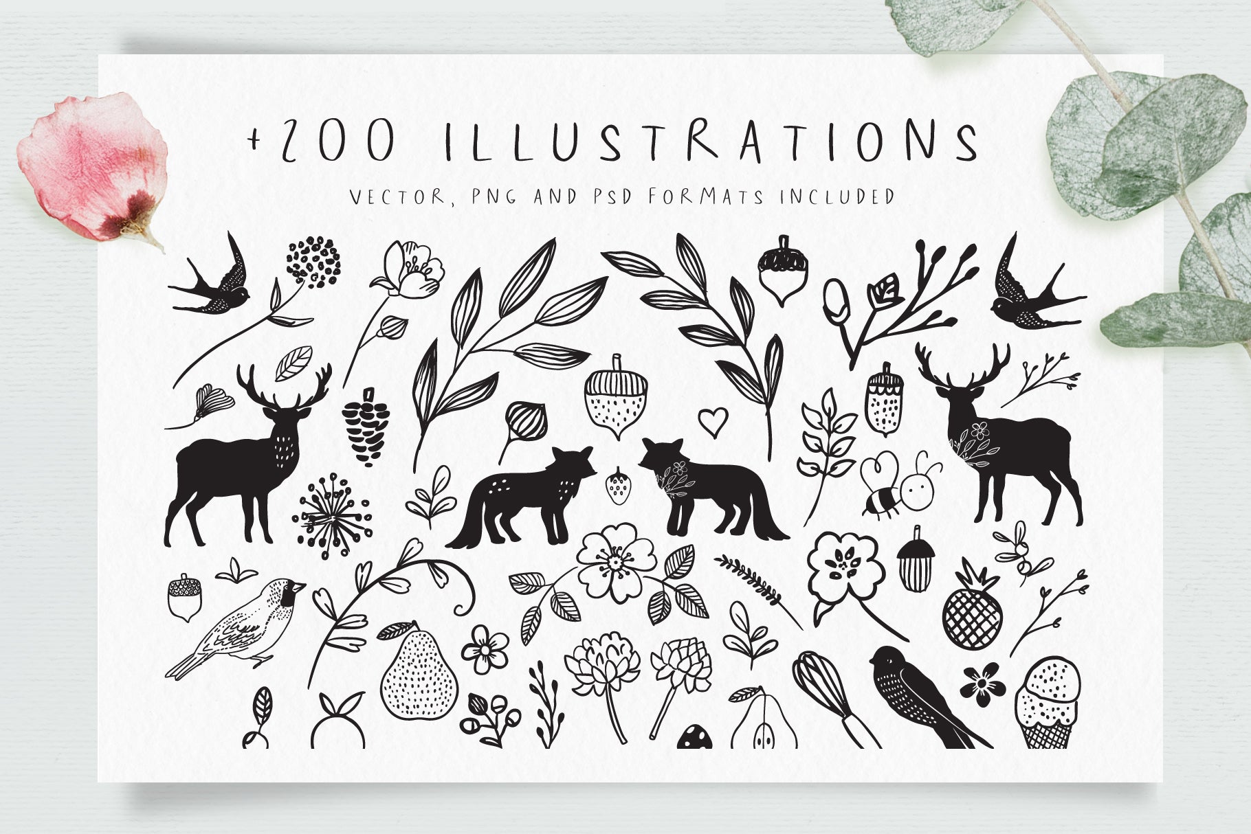 Illustrations: More than 200 hand drawn illustrations that you can combine with the fonts to create professional looking logos. Includes vectors in AI, EPS and a handy file with all the illustrations in PSD/PNG that you can easily cut in your design program as you need.